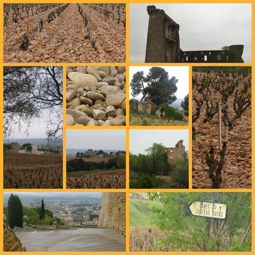 There he is - the famous Harry and he smiles and has a sense of humor - this should be fun. Let's go a wine tasting! But first we tour the vineyards cause they are different. Really different. Glaciers were active in the Avignon region and pushed up rocks from the riverbed of the Rhone - tons and tons of smooth river Rock that cover much of the ground. So much of the ground is covered in rocks with vines sticking up here and there. It is early Spring and the vines have just broken buds in the last week. There are no supporting wires for the grapes here so it just looks different. Take a look at the photos Tina will post.